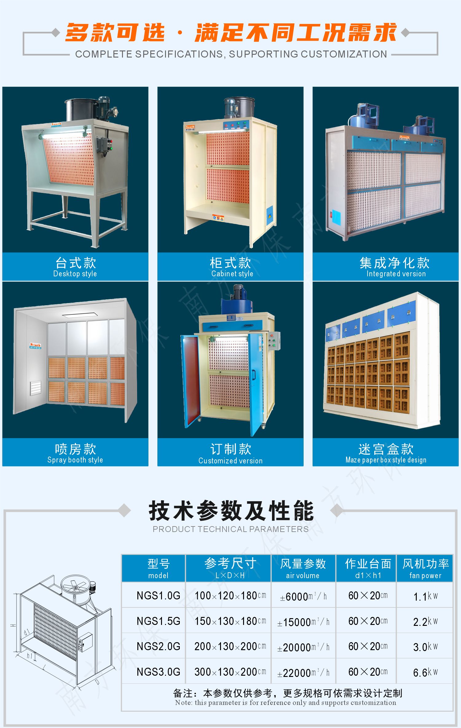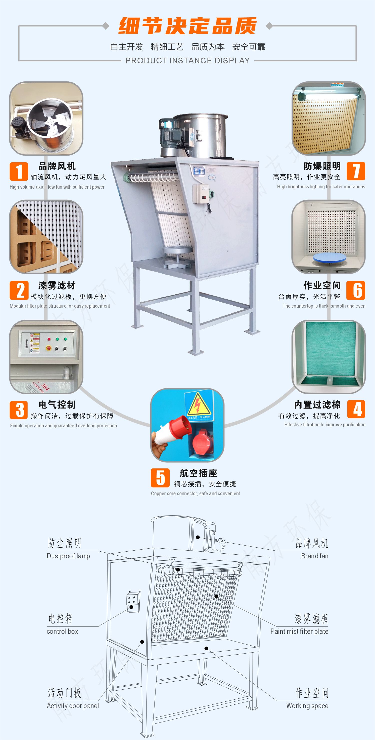 -     喷漆漆雾净化环保柜 干式过滤漆尘喷油台 涂装捕集除尘设备设计定制详细信息| 询价留言加工定制:是 品牌:设计定制 型号:1.5T型/台式款 处理浓度:±100 mg/l 处理风量:±8000 m3/h 启燃温度:≤80 ℃ 空速:±2.0m/s 参考尺寸(cm):150×120×170 功率:2.2kw