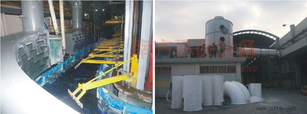 经中山南方南方环保工程设备公司现场堪察、工艺设计以及方案实施,对电镀生产线酸雾废气进行治理净化;处理工艺:金属件电镀过程所挥发的盐酸酸雾 → PP集气罩 → 玻璃钢集风管 → 玻璃钢酸雾净化塔 → 玻璃钢引风机 → 达标排放,设计处理量:42000M3/H;经投入运行及检验,各项设施的净化效果均达到厂方车间环境及环保排放规定之要求。